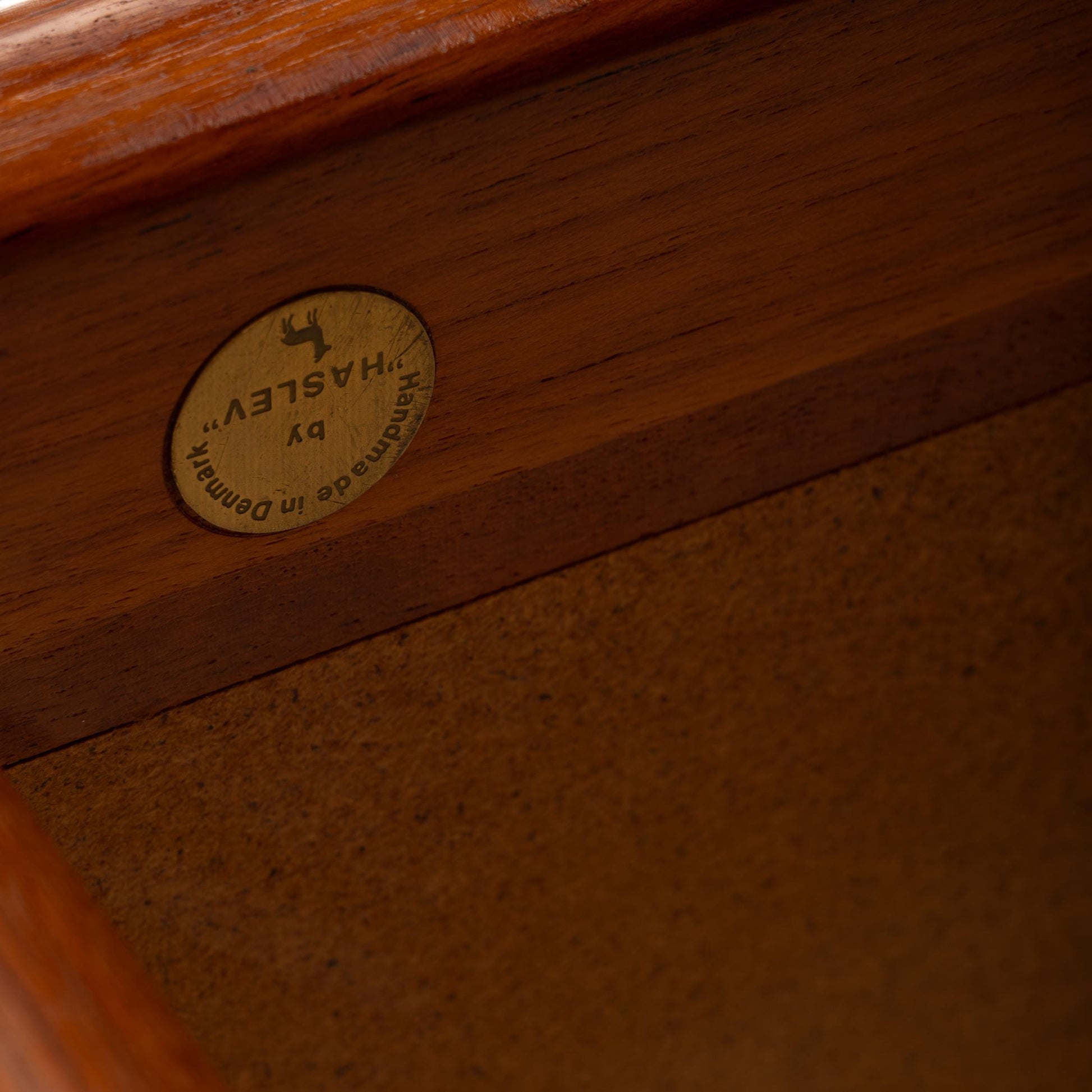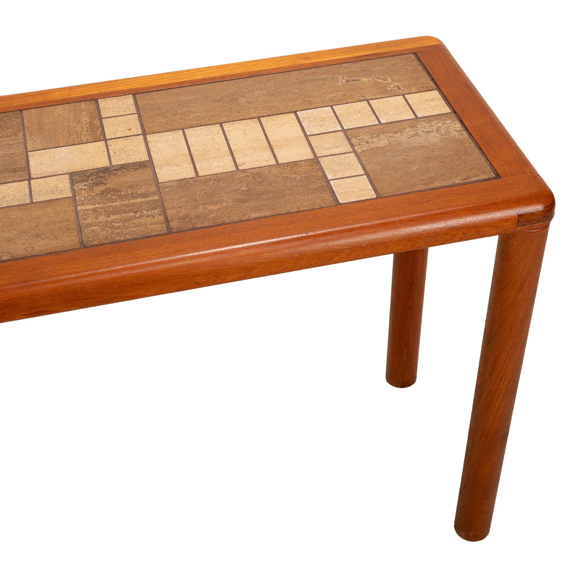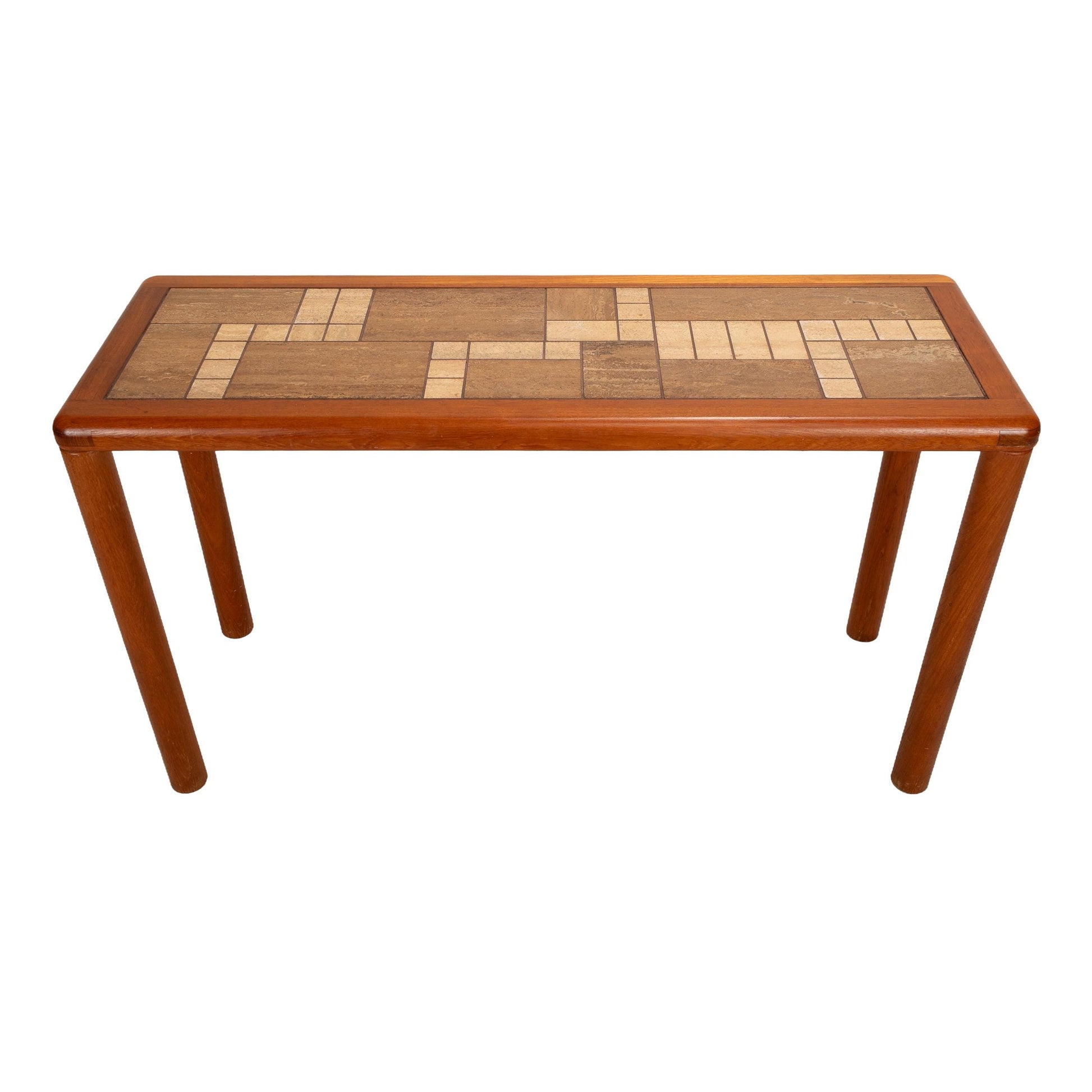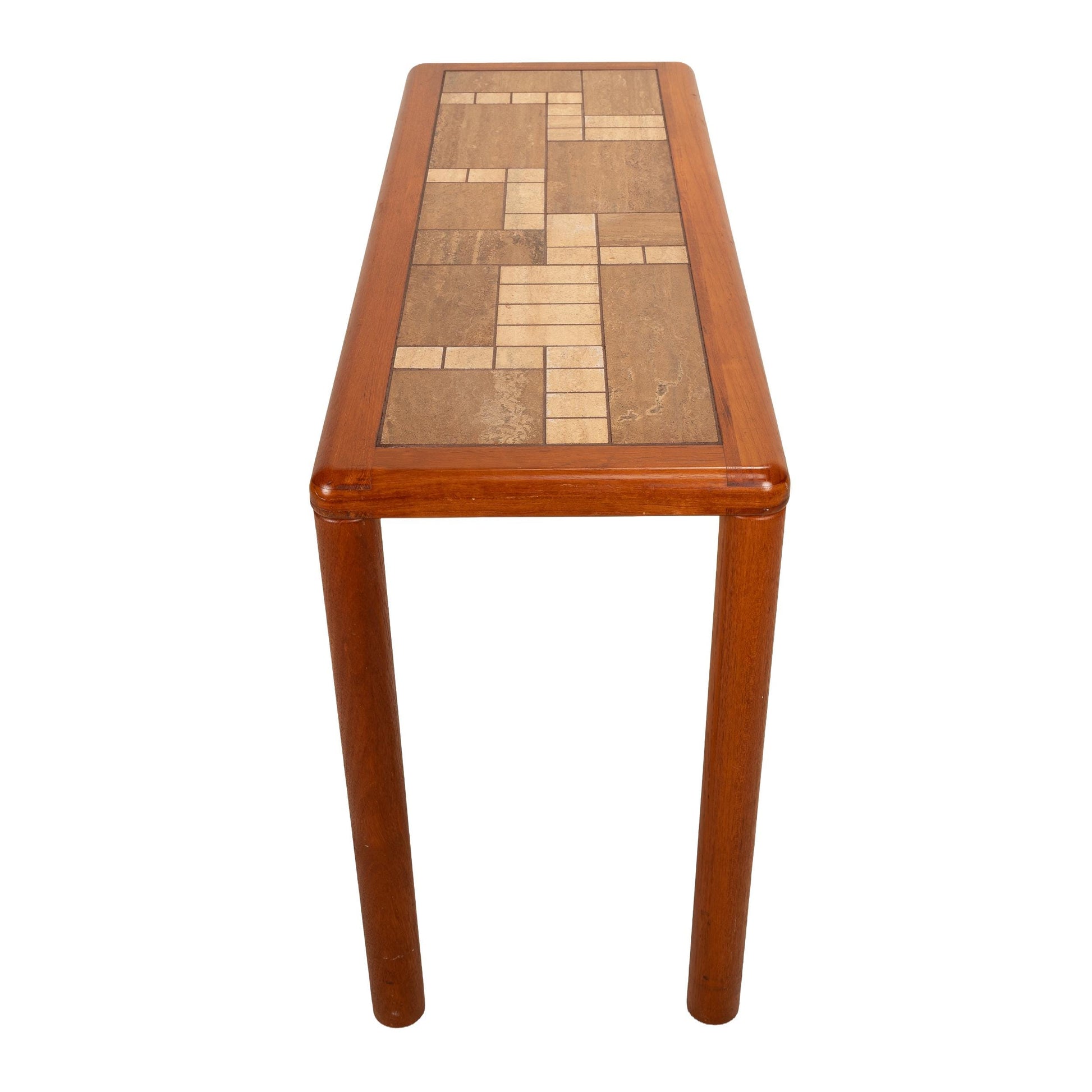 Description: Mid-century Danish Modern console or sofa table crafted by Haslev Møbelsnedkeri. Features a solid teak frame with rounded corners and cylindrical legs, surrounding a beautifully composed tile mosaic top in natural tan and brown hues. The craftsmanship is exceptional — precise joinery, smooth finish, and timeless Scandinavian restraint. Perfect for use in an entryway, hallway, or behind a sofa. Maker’s mark stamped beneath: “Handmade in Denmark by Haslev.”