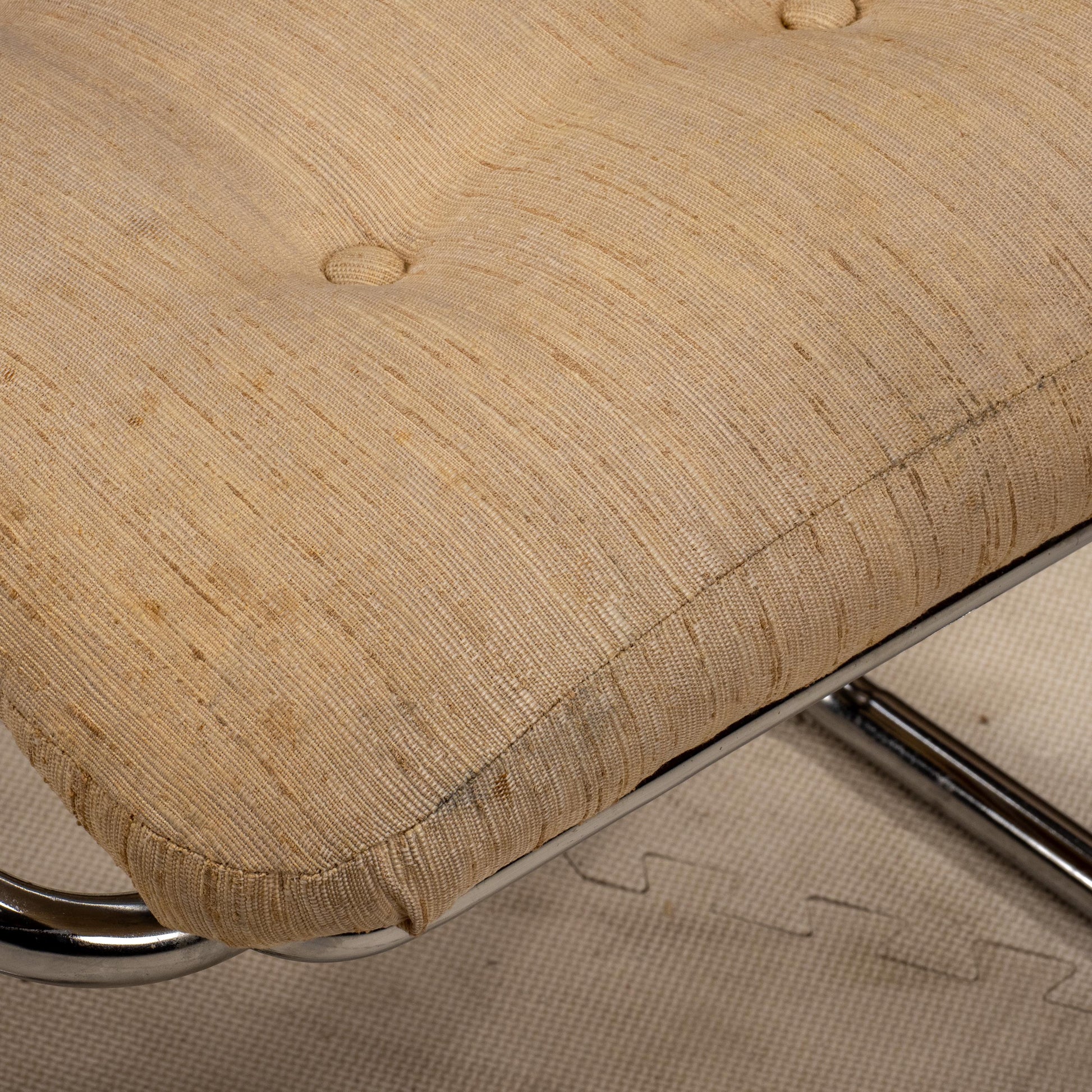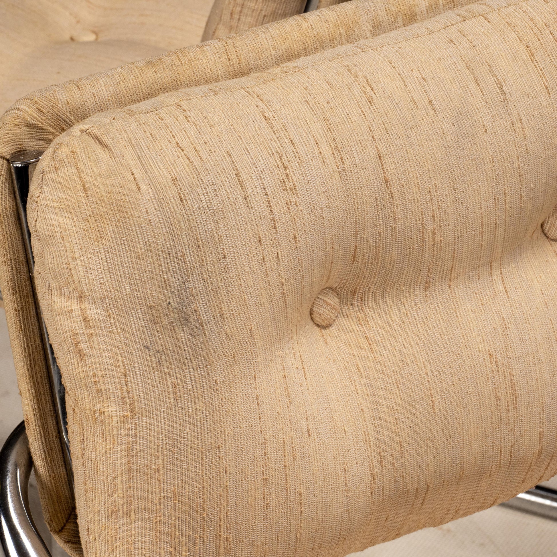A well-made set with a strong, simple presence. Condition Good overall condition. Chrome frames are in excellent shape. Upholstery shows staining throughout. No tag remains on the chairs but these are certainly original Jerry Johnson, we have sold them several times in the past.
