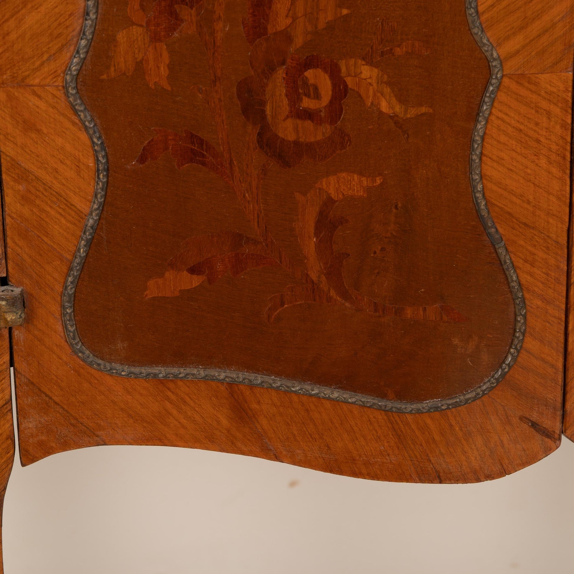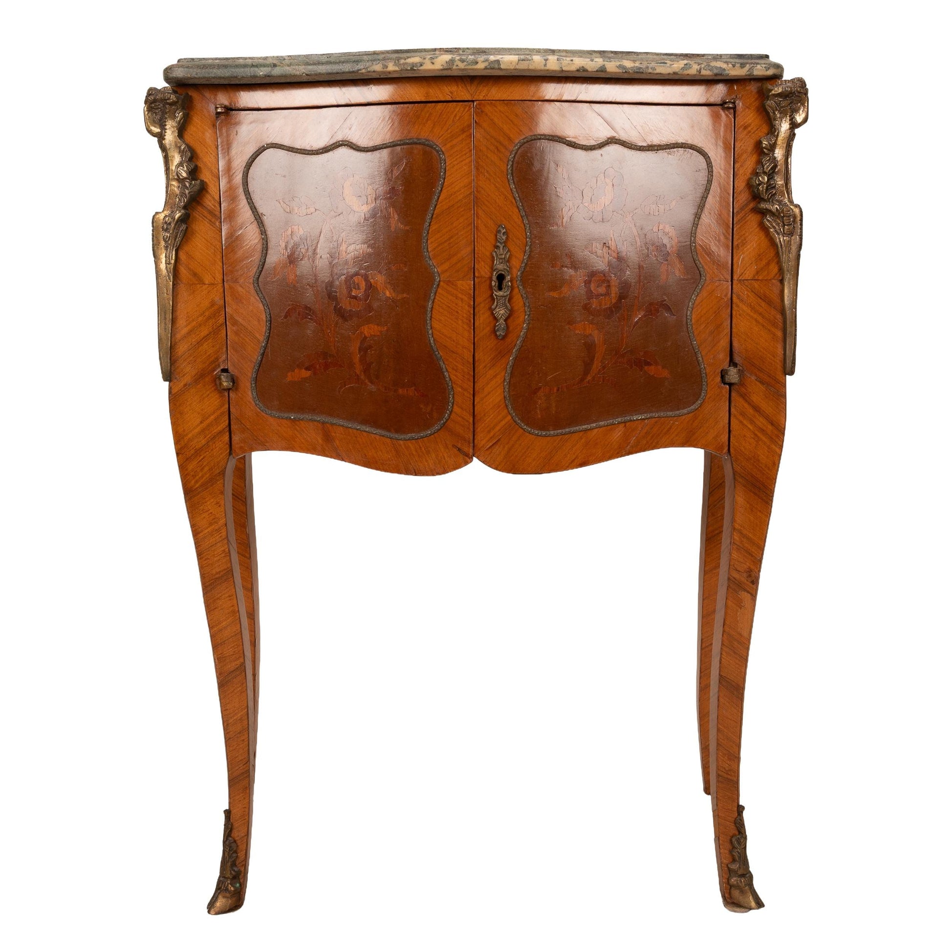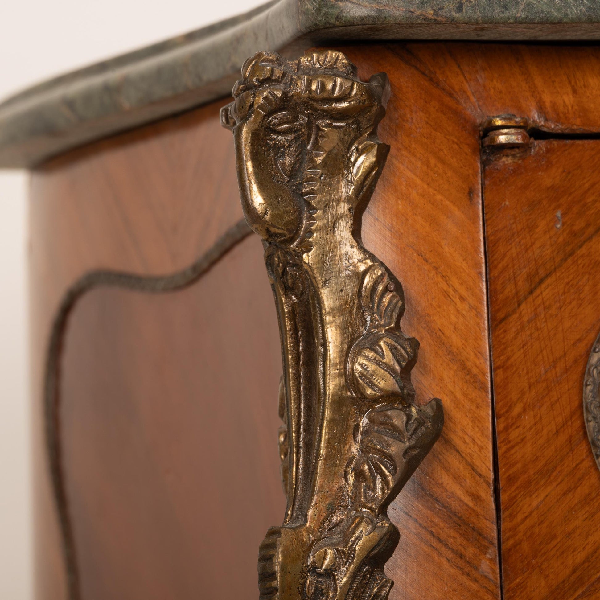 The commode likely dates from the early to mid-20th century, inspired by 18th-century French design. The green marble top has soft, natural veining and a shaped edge that complements the graceful form of the wood base. Delicate floral inlay work and bronze ormolu mounts add beautiful decorative detail.