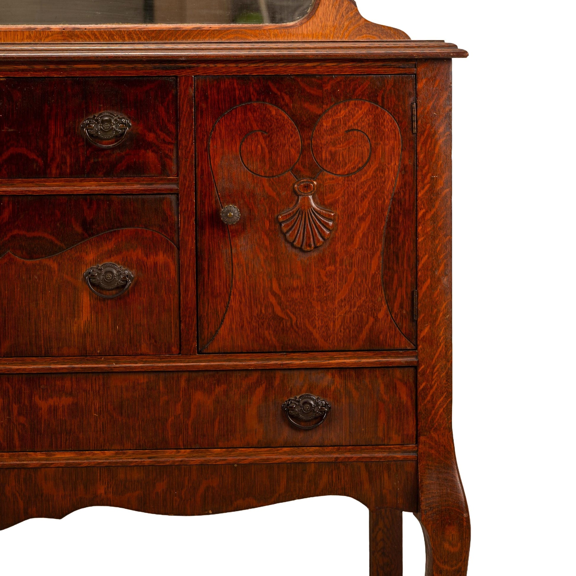 A beautifully crafted antique tiger oak sideboard featuring stunning quarter-sawn grain, elegant carved details, and a shapely silhouette that instantly elevates any dining room, entryway, or living space. This piece showcases the classic craftsmanship of the early 1900s, complete with carved shell motifs, graceful cabriole legs, and its original beveled mirror.