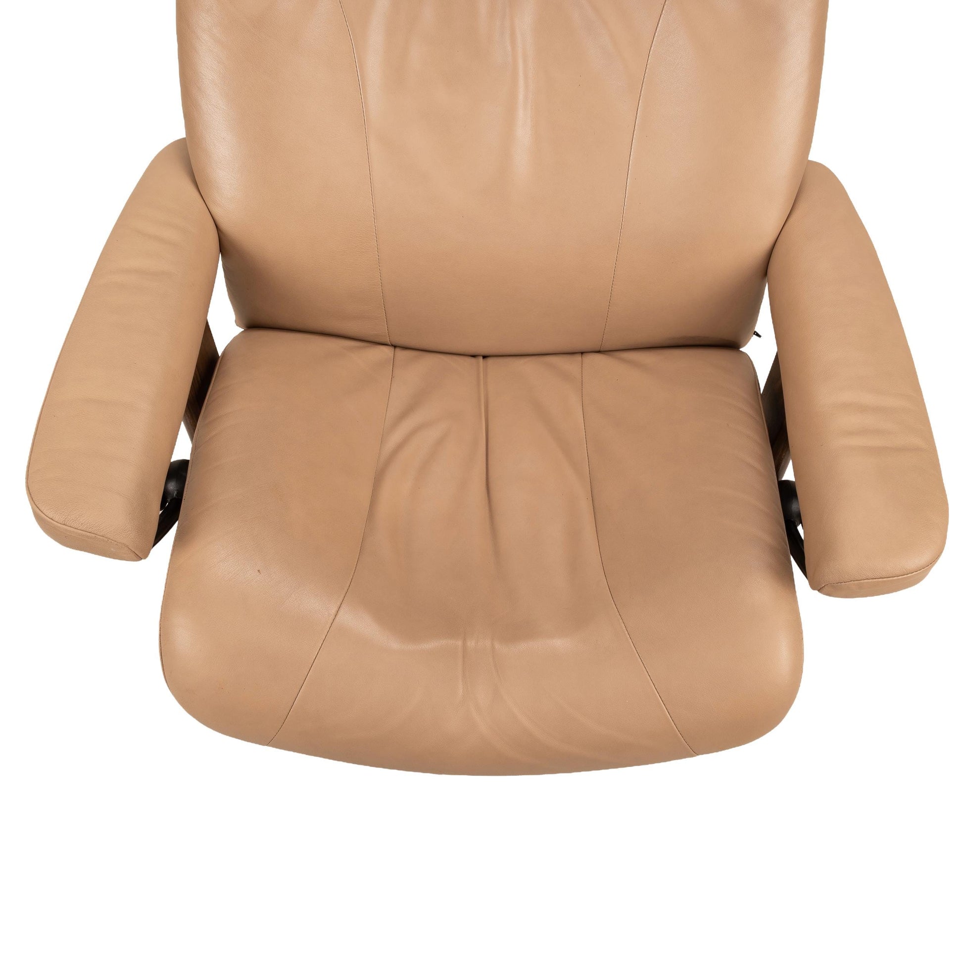 The chair is in good condition overall, with light markings and staining from normal use. The leather is soft and comfortable with no tears or major damage. The recline mechanism works, but the hand knobs no longer hold the chair firmly in a locked position. This is common on older Stressless models and is usually fixed by replacing the small friction pads, which cost about $15 online if you’d like the chair to lock fully upright or fully reclined.