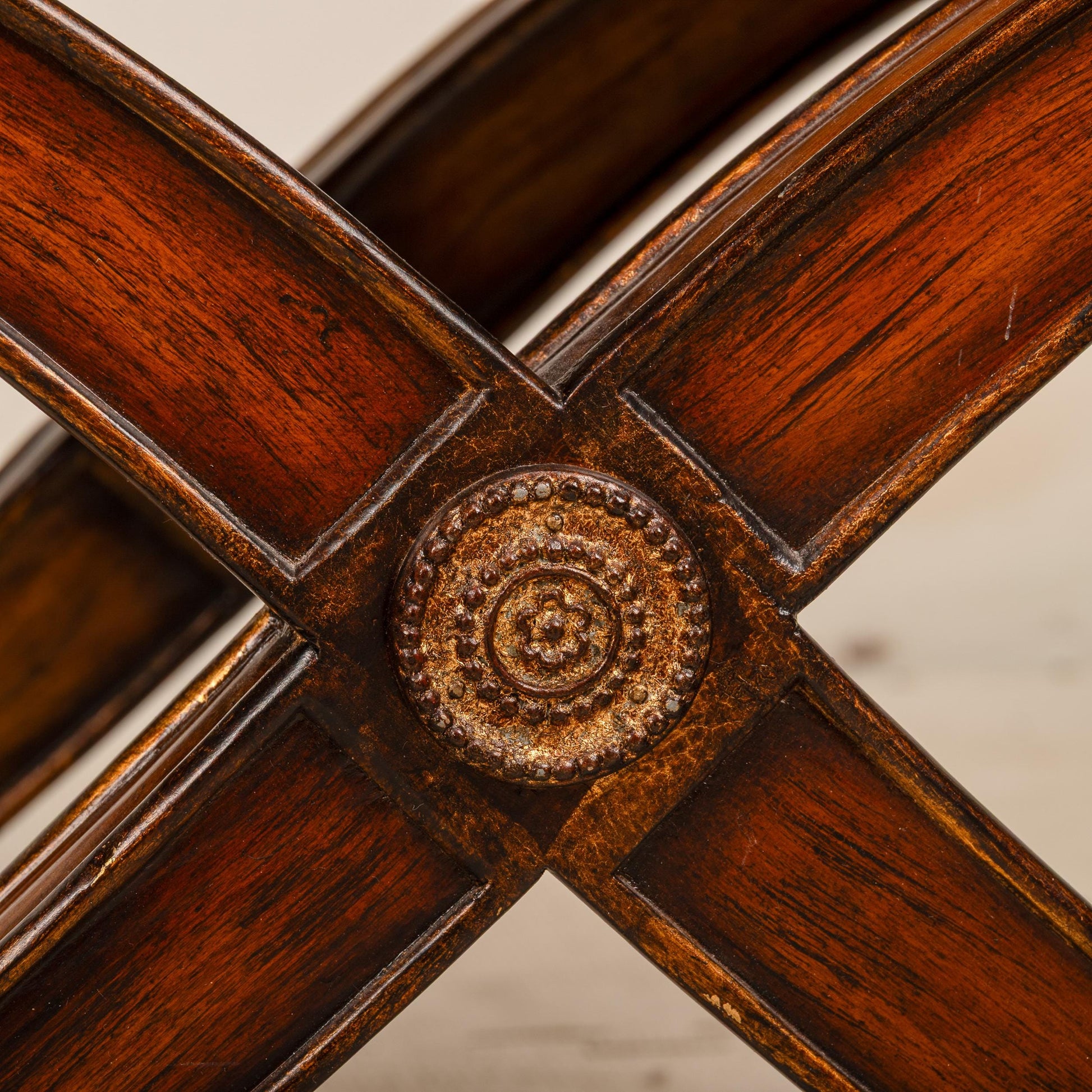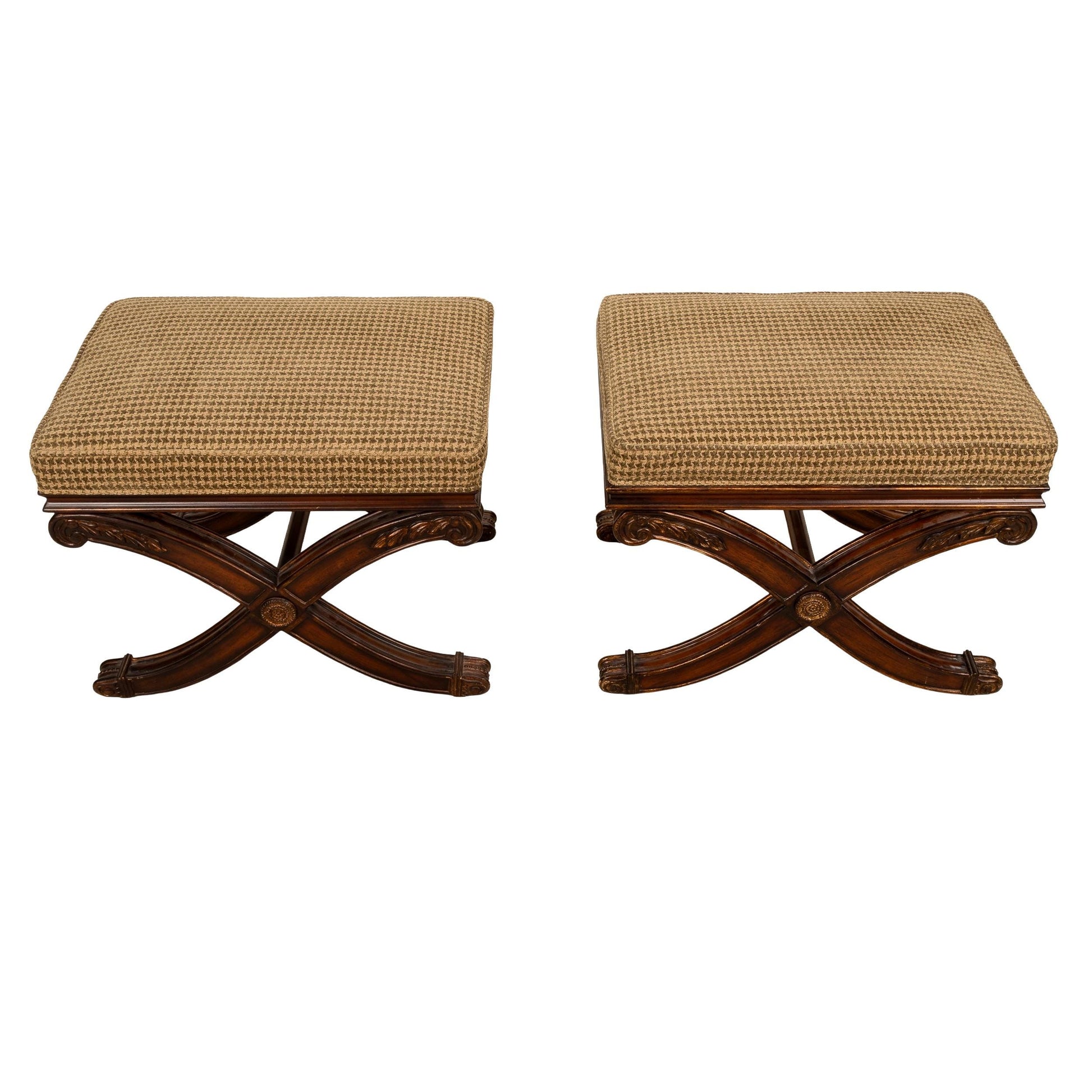 Ethan Allen Carved Wood X-Base Low Stools With Houndstooth Upholstery - A Pair