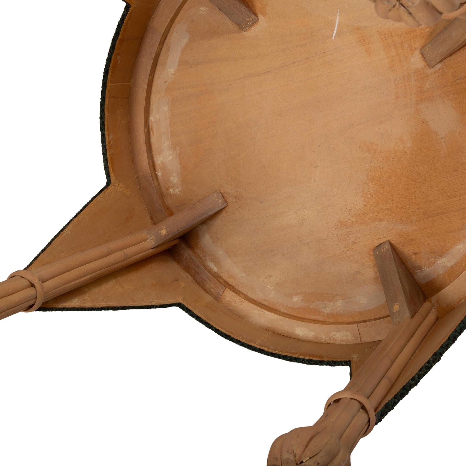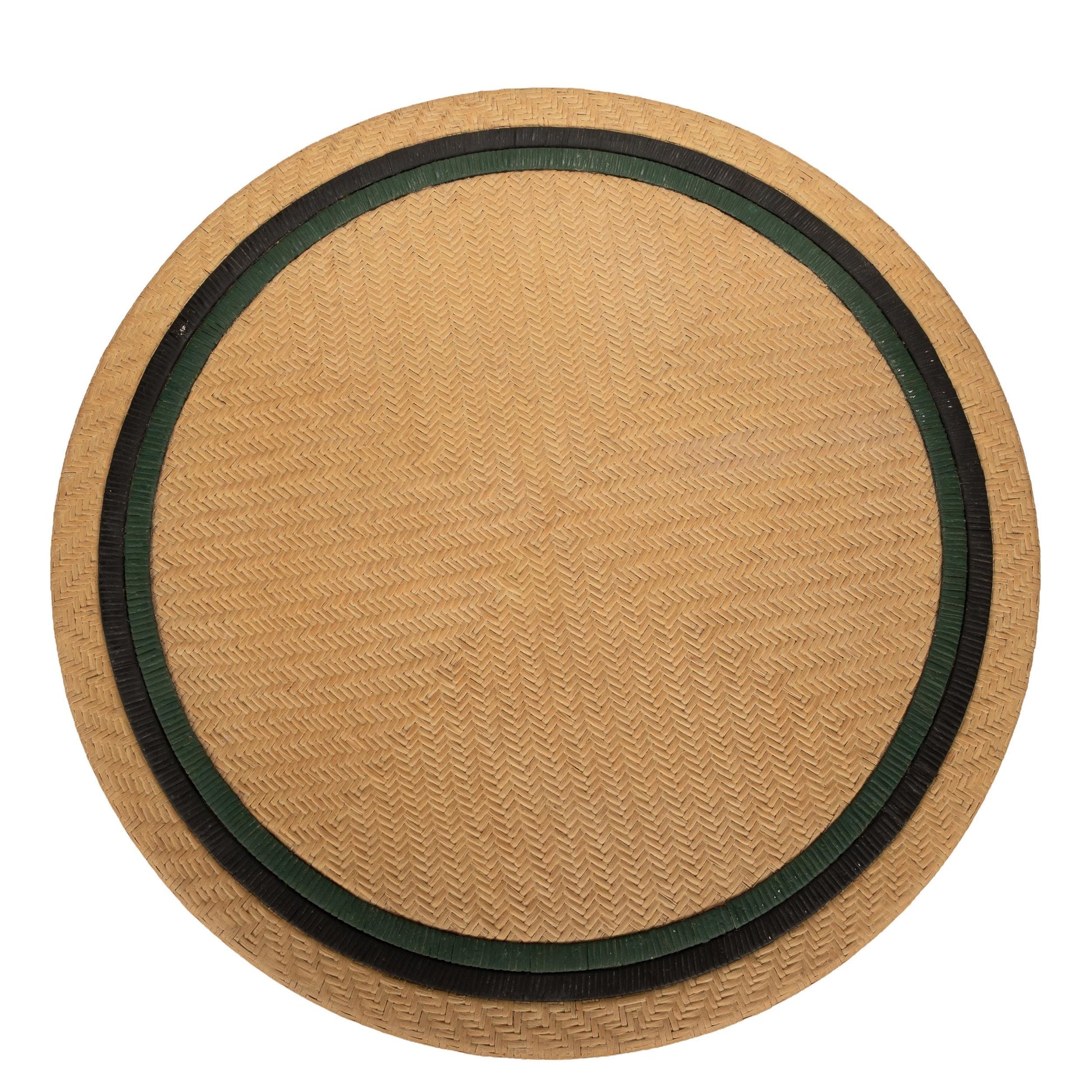 The table is supported by carved wood legs and features detailed weaving with green and earthy tones that highlight its bold, graphic design.